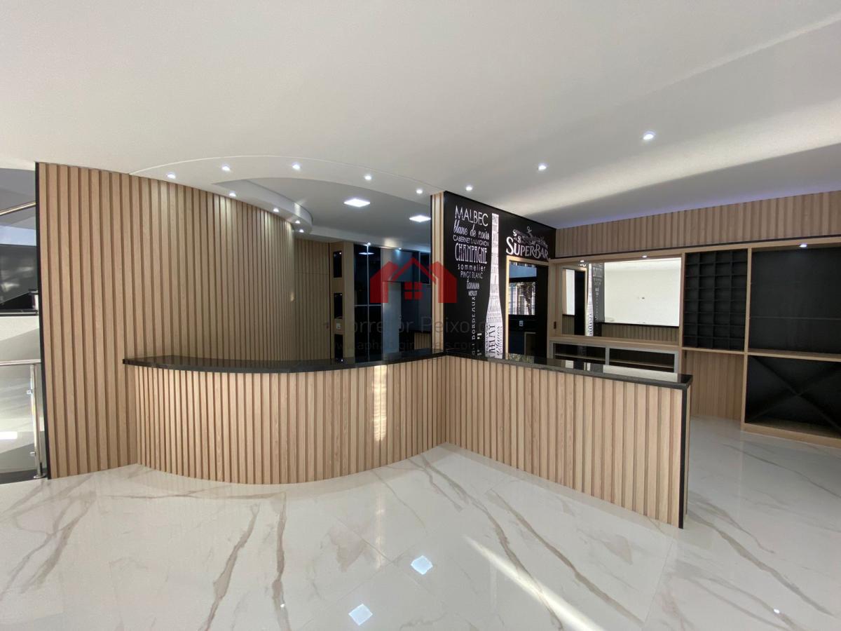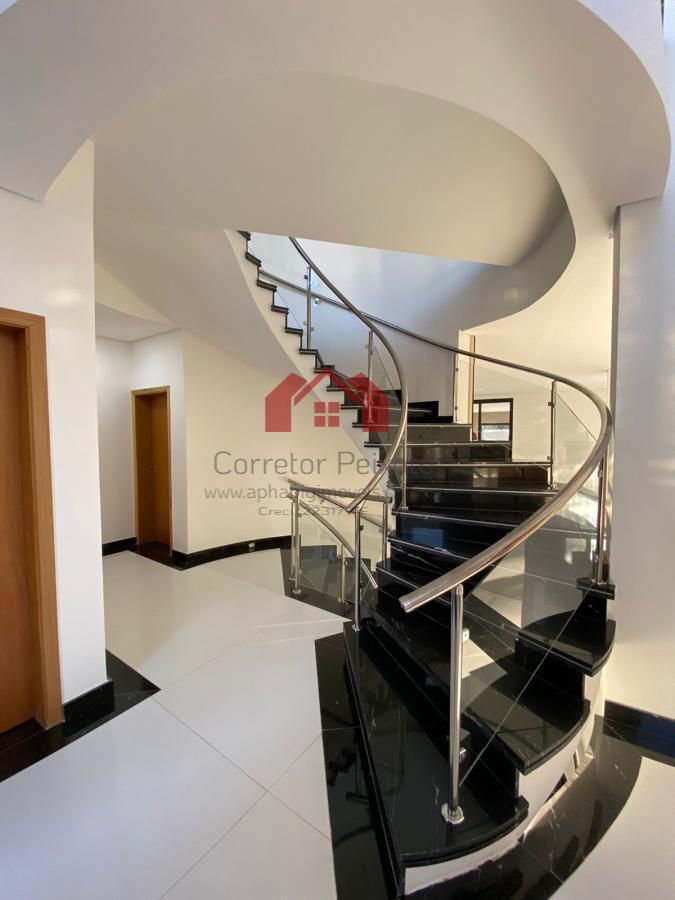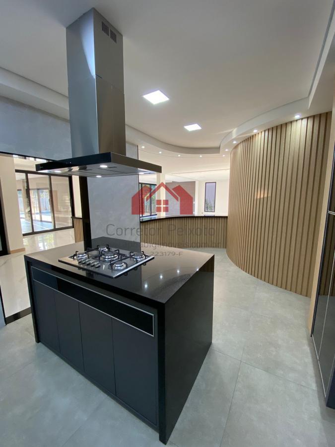 Pavimento térreo - entrada com meia lua externa com espaço para 3 carros, hall social amplo e pé direito duplo, lavabo, sala de lareira, escritório com banheiro( pode usar como suíte também), cozinha completa com conceito aberto, despensa, sala ampla para 3 ou 4 ambientes, bar com adega, área gourmet ampla completa, sauna úmida, banheiro, área externa super aproveitada com amplo jardim, ducha, corredor de serviço lateral, piscina com enorme prainha, cromoterapia e pontos de hidro, lavanderia com acesso de serviço a copa no piso superior.