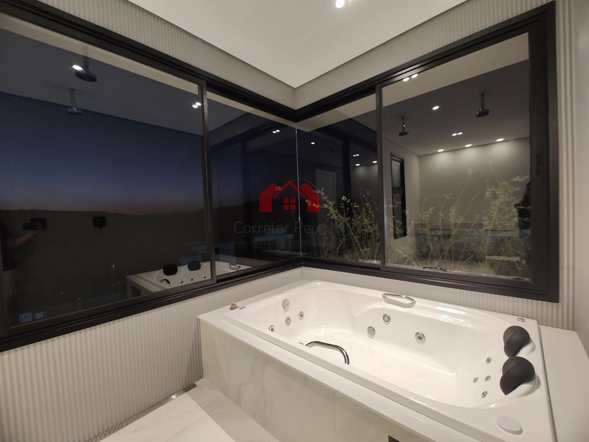 - Ampla suíte master privativa no pavimento superior, composta por espaçoso closet, varanda, e banheiro com hidromassagem com cromoterapia e linda vista para a reserva florestal;